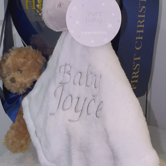 Give your little one the perfect cuddly companion with our personalised baby comforter, lovingly embroidered with your baby’s name. Soft, soothing, and made for tiny hands, this comforter quickly becomes baby’s favourite snuggle buddy — offering comfort, security, and warmth wherever they go.